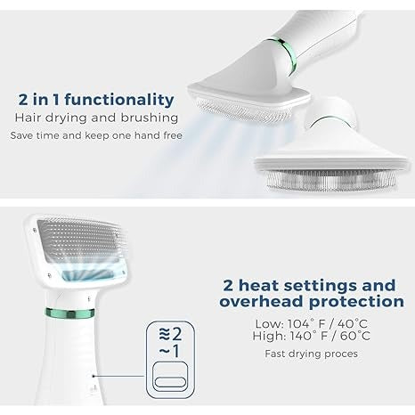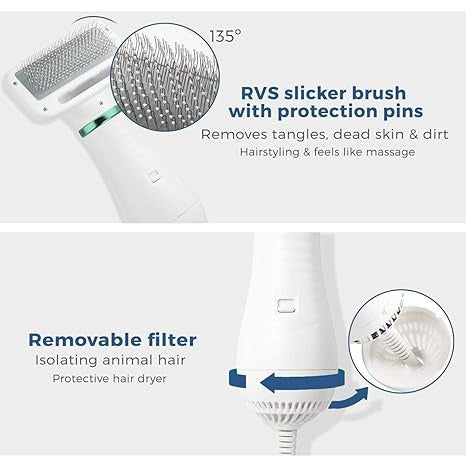 Nuestro cepillo combina la potencia del secador con la suavidad de un cepillo, reduciendo el tiempo de secado y dejando a tu mascota lista para brillar. Ideal para perros, gatos y otras mascotas peludas. Además, puedes usarlo para desenredar y eliminar el pelo suelto.